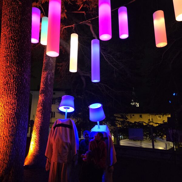 They will interact each other but also with people encountered in the street, using their head/lampshade like a light brush to joyfully splash the public space with colors and drive away the greyness of everyday life.